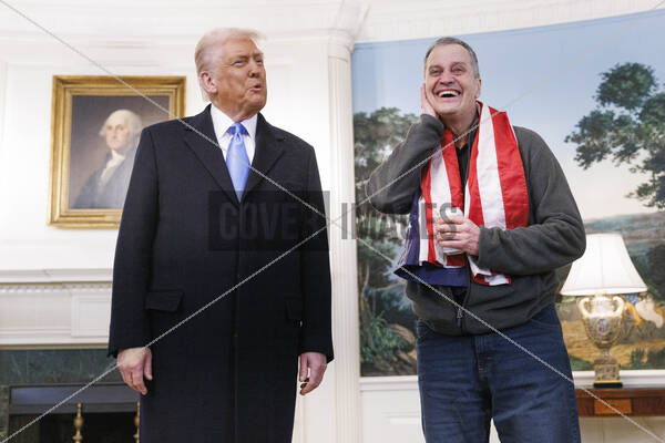 US President Donald Trump greets Mark Fogel, who was recently released from prison in Russia, in the Diplomatic Reception Room in Washington DC