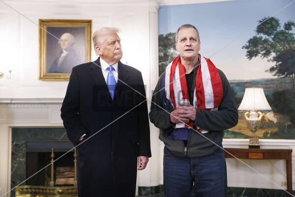US President Donald Trump greets Mark Fogel, who was recently released from prison in Russia, in the Diplomatic Reception Room in Washington DC
