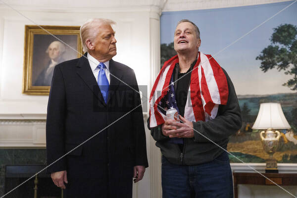 US President Donald Trump greets Mark Fogel, who was recently released from prison in Russia, in the Diplomatic Reception Room in Washington DC