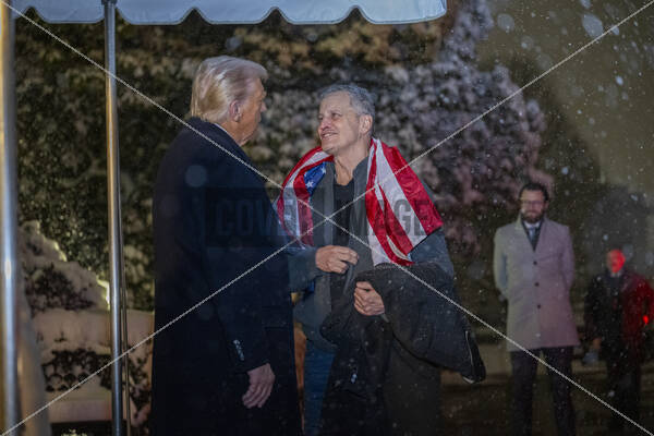 US President Donald Trump welcomes Mark Fogel, who was recently released from prison in Russia, on the South Portico of the White House in Washington DC on Tuesday, February 11, 2025. Fogel has been in captivity since 2021.