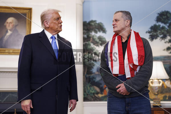 US President Donald Trump greets Mark Fogel, who was recently released from prison in Russia, in the Diplomatic Reception Room in Washington DC