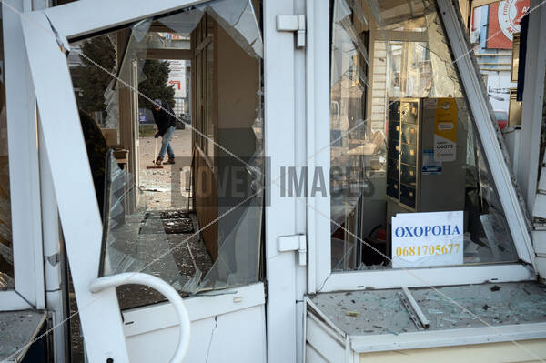 A man sweeps away glass shards in the Obolonskyi district after a Russian ballistic missile strike