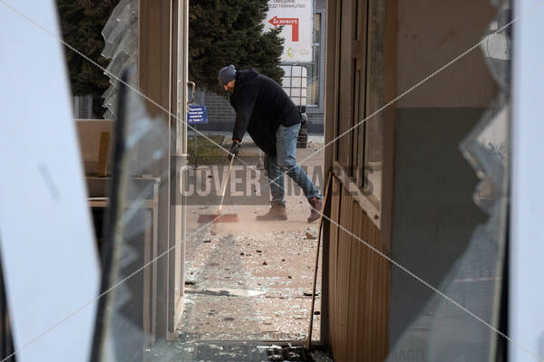 A man sweeps away glass shards in the Obolonskyi district after a Russian ballistic missile strike