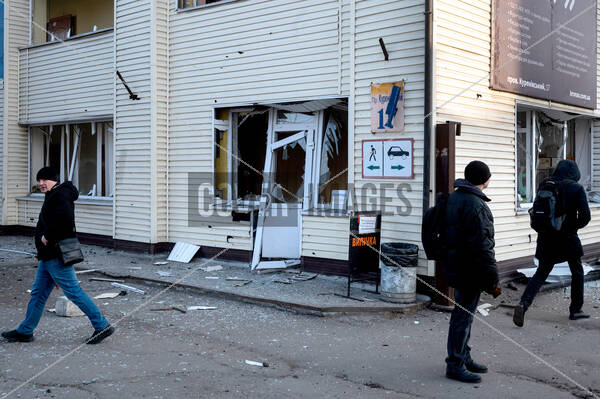 People walk past a building in the Obolonskyi district damaged by a Russian ballistic missile strike