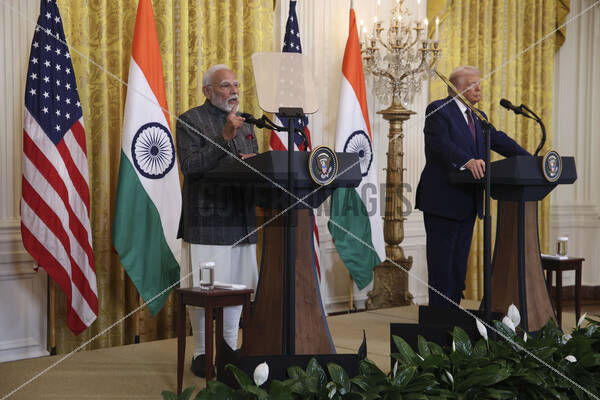 United States President Donald J Trump and Prime Minister Narendra Modi of India hold a joint press conference in the East Room of the White House in Washington, DC, February 13, 2025.