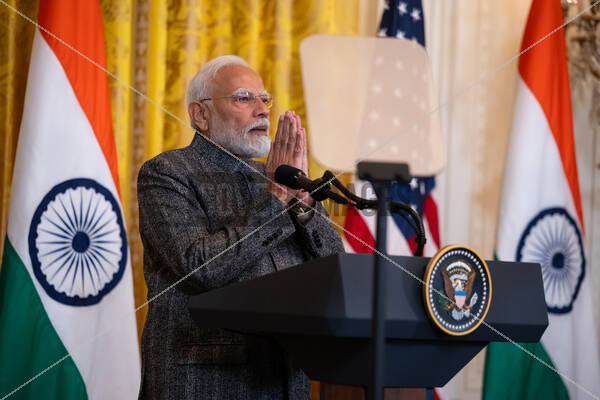 Prime Minister Narendra Modi of India speaks during a joint press conference with United States President Donald J Trump in the East Room of the White House