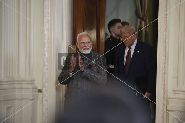 United States President Donald J Trump, right, and Prime Minister Narendra Modi of India, left, arrive for a joint press conference in the East Room of the White House in Washington, DC, February 13, 2025.