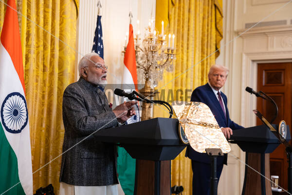 United States President Donald J Trump and Prime Minister Narendra Modi of India hold a joint press conference in the East Room of the White House in Washington, DC, February 13, 2025.