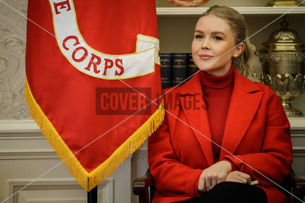 White House Press Secretary Karoline Leavitt sits along the side of the Oval Office as United States President Donald Trump signs two Executive Orders at the White House on February 14, 2025 in Washington, D.C. The Executive Orders signed today were on federal funding going to schools and universities related to the coronavirus pandemic as well as energy production.