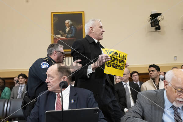 Pro-PEPFAR demonstrators, protesting the defunding of the United States Agency for International Development (USAID), are escorted from a US House Committee on Foreign Affairs hearing entitled “The USAID Betrayal” by US Capitol Police in the Rayburn House Office Building on Capitol Hill in Washington