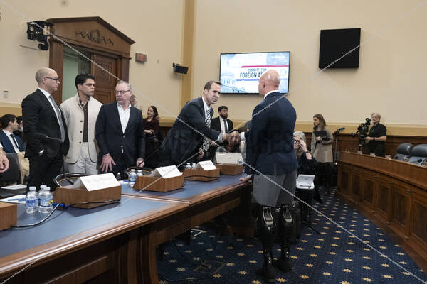 United States Representative Brian Mast (Republican of Florida), Chair, US House Committee on Foreign Affairs, shakes hands with the family of a witness at a House Committee on Foreign Affairs Hearing entitled “The USAID Betrayal” in the Rayburn House office building in Washington