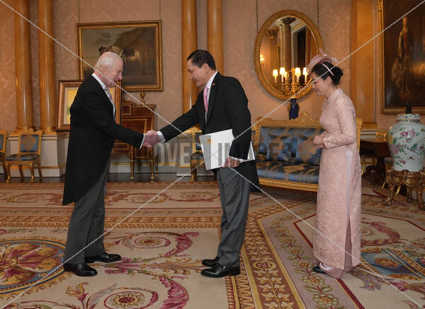 Do Minh Hung, Ambassador from the Socialist Republic of Viet Nam, presents his credentials to King Charles III, alongside his wife Tu Anh Dang, during a private audience at Buckingham Palace