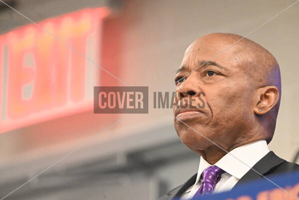 Mayor Eric Adams (Democrat of New York, New York) delivers remarks at a press conference announcing a public safety and quality of life initiative inside of a conference room at the New York City Police Department 40th Precinct as a judge is weighing whether to dismiss his corruption case in Bronx