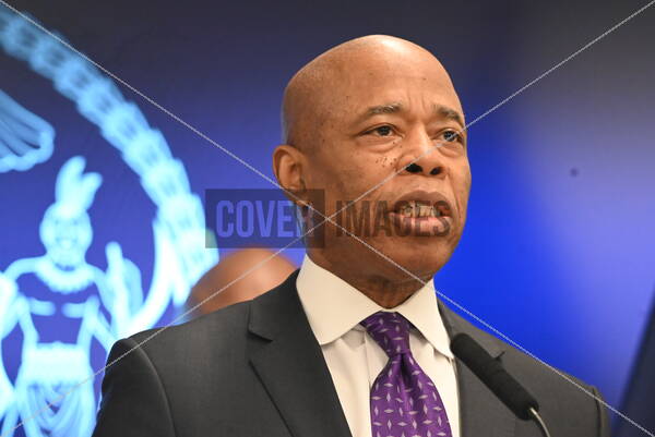 Mayor Eric Adams (Democrat of New York, New York) delivers remarks at a press conference announcing a public safety and quality of life initiative inside of a conference room at the New York City Police Department 40th Precinct as a judge is weighing whether to dismiss his corruption case in Bronx