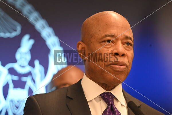 Mayor Eric Adams (Democrat of New York, New York) delivers remarks at a press conference announcing a public safety and quality of life initiative inside of a conference room at the New York City Police Department 40th Precinct as a judge is weighing whether to dismiss his corruption case in Bronx