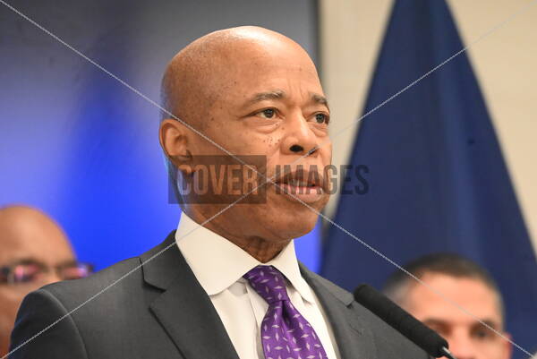 Mayor Eric Adams (Democrat of New York, New York) delivers remarks at a press conference announcing a public safety and quality of life initiative inside of a conference room at the New York City Police Department 40th Precinct as a judge is weighing whether to dismiss his corruption case in Bronx