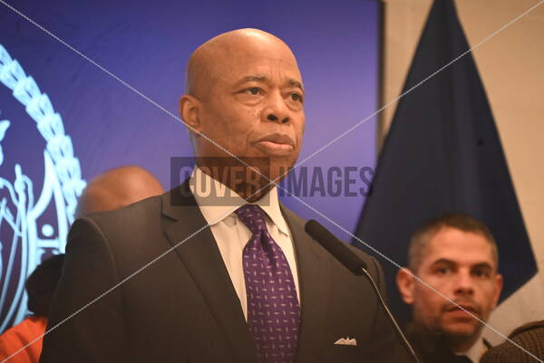 Mayor Eric Adams (Democrat of New York, New York) delivers remarks at a press conference announcing a public safety and quality of life initiative inside of a conference room at the New York City Police Department 40th Precinct as a judge is weighing whether to dismiss his corruption case in Bronx