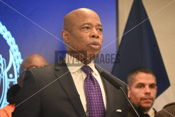 Mayor Eric Adams (Democrat of New York, New York) delivers remarks at a press conference announcing a public safety and quality of life initiative inside of a conference room at the New York City Police Department 40th Precinct as a judge is weighing whether to dismiss his corruption case in Bronx