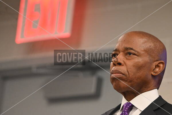 Mayor Eric Adams (Democrat of New York, New York) delivers remarks at a press conference announcing a public safety and quality of life initiative inside of a conference room at the New York City Police Department 40th Precinct as a judge is weighing whether to dismiss his corruption case in Bronx