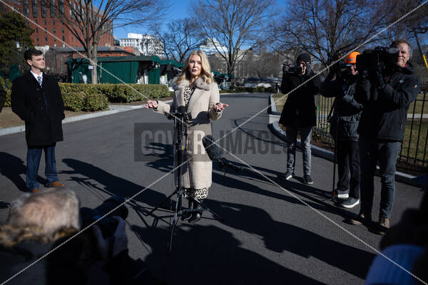 White House Press Secretary Karoline Leavitt speaks with reporters outside the White House