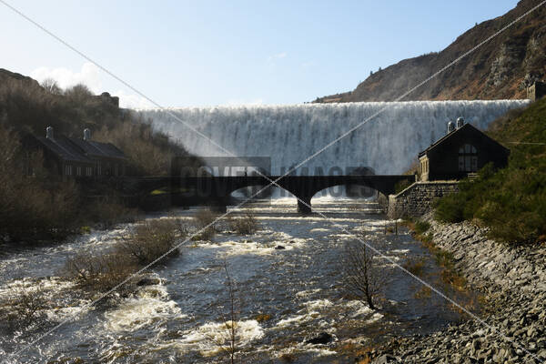 Caban Coch Dam in Elan Valley, Wales overflows following heavy rain