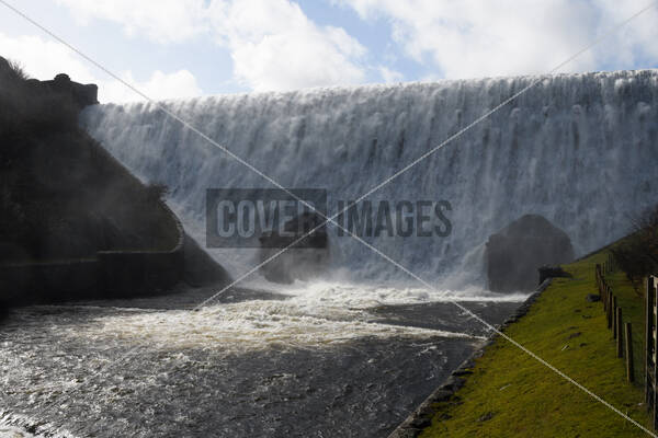 Caban Coch Dam in Elan Valley, Wales overflows following heavy rain
