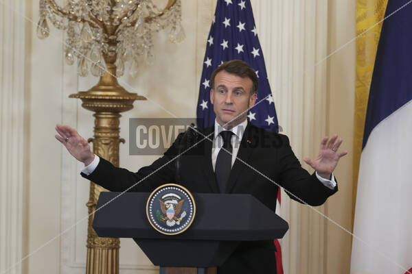 United States President Donald Trump and President Emmanuel Macron of France speak during a joint press conference in the East Room of the White House