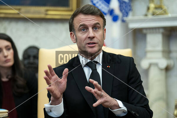 President of France Emmanuel Macron speaks while meeting with President Donald Trump in the Oval Office at the White House
