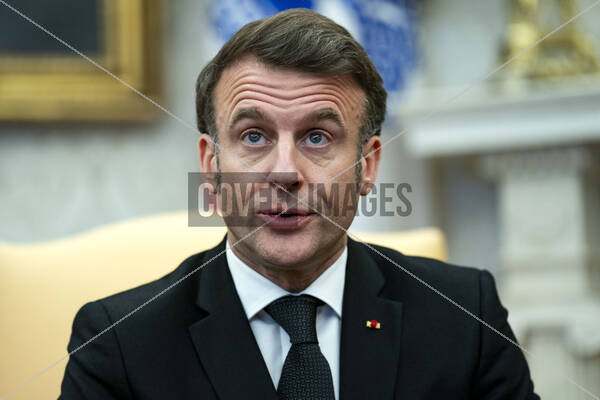 President of France Emmanuel Macron speaks while meeting with President Donald Trump in the Oval Office at the White House