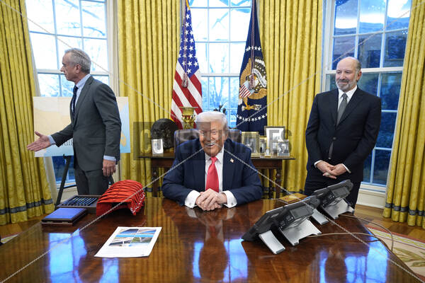 United States President Donald Trump smiles as he speaks to reporters after signing Executive Orders in the Oval Office of the White House in Washington Standing behind the President are US Secretary of Health and Human Services Robert F. Kennedy, Jr, left and US Secretary of Commerce Howard Lutnick, right.