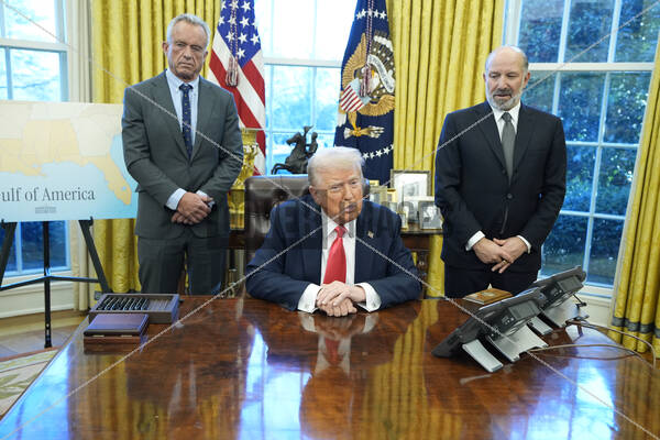 United States President Donald Trump speaks to reporters after signing Executive Orders in the Oval Office of the White House in Washington Standing behind the President are US Secretary of Health and Human Services Robert F. Kennedy, Jr, left and US Secretary of Commerce Howard Lutnick, right.