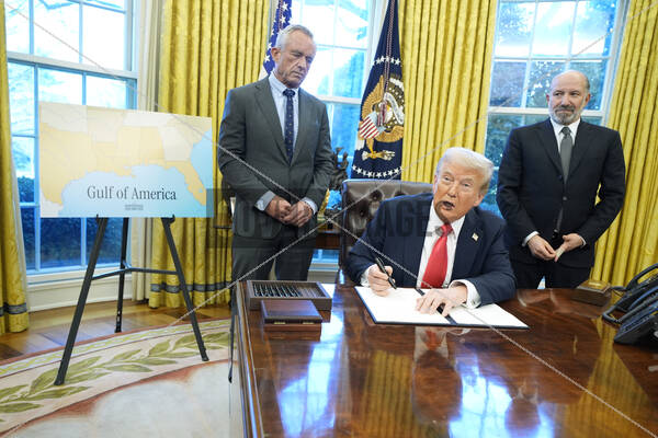 United States President Donald Trump speaks to reporters after signing Executive Orders in the Oval Office of the White House in Washington Standing behind the President are US Secretary of Health and Human Services Robert F. Kennedy, Jr, left and US Secretary of Commerce Howard Lutnick, right.