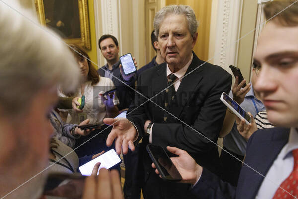 United States Senator John Kennedy (Republican of Louisiana) speaks with members of the media as he arrives to a meeting with Senate Republicans and White House Chief Of Staff Susie Wiles in the Capitol Building in Washington