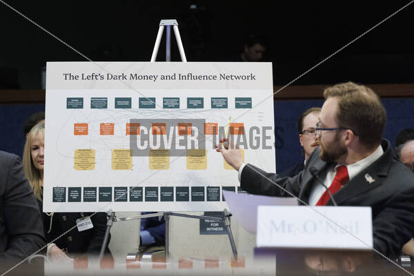 Tyler O’Neil, Managing Editor of The Daily Signal, motions to a chart during a House Oversight Subcommittee on Delivering on Government Efficiency hearing on USAID, in the Capitol Building in Washington
