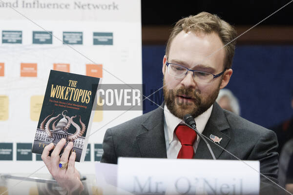 Tyler O’Neil, Managing Editor of The Daily Signal, holds his book ‘The Woketopus’ during a House Oversight Subcommittee on Delivering on Government Efficiency hearing on USAID, in the Capitol Building in Washington