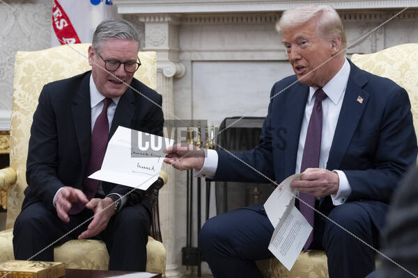 United States President Donald J Trump and Prime Minister Keir Starmer of the United Kingdom, discuss an invitation from King Charles inviting Trump to visit the United Kingdom, in the Oval Office of the White House in Washington, DC