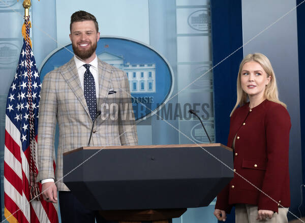 White House Press Secretary Karoline Leavitt poses with her guest Harrison Butker, kicker, with the AFC Champion Kansas City Chiefs in the James S Brady Press Briefing Room of the White House