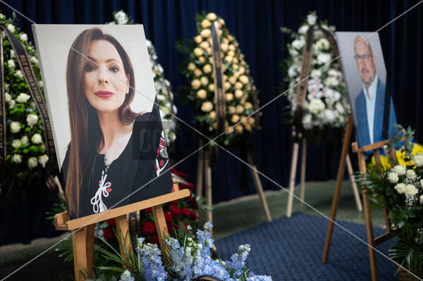 The photos of Ukrinform journalist Tetiana Kulyk and her husband, renowned oncologist Pavlo Ivanchov, who were killed in the Russian drone attack in Kriukivshchyna village, Kyiv region, on February 26, are displayed during a laying-in-repose ceremony at the Bohomolets National Medical University