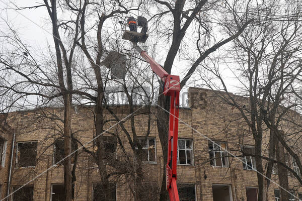 Utility workers remove structural debris from tree branches after a massive Russian drone attack on Kharkiv, Ukraine