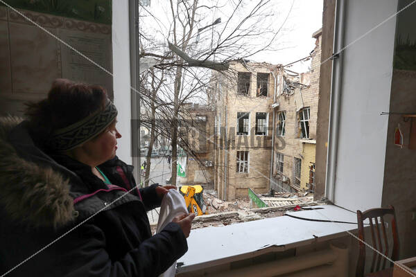 A woman looks out of a broken window of a dental clinic damaged by a massive Russian drone attack on Kharkiv, Ukraine