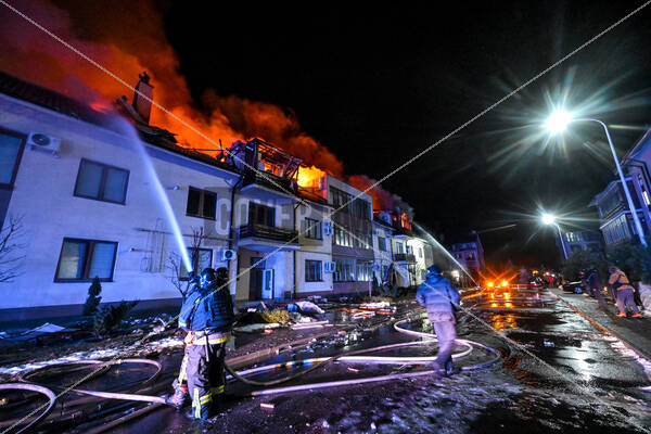 Rescuers extinguish the fire caused by a Russian drone fall on a residential building, Zaporizhzhia, Ukraine