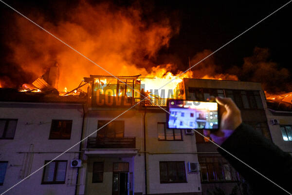 A man films a residential building on fire following a Russian drone attack, Zaporizhzhia, Ukraine