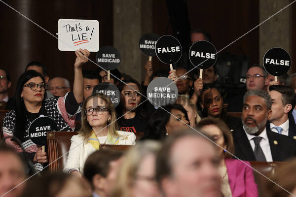 Democrats hold protest signs as U.S. President Donald Trump address a joint session of Congress at the U.S. Capitol on March 04, 2025 in Washington, DC. President Trump was expected to address Congress on his early achievements of his presidency and his upcoming legislative agenda.
