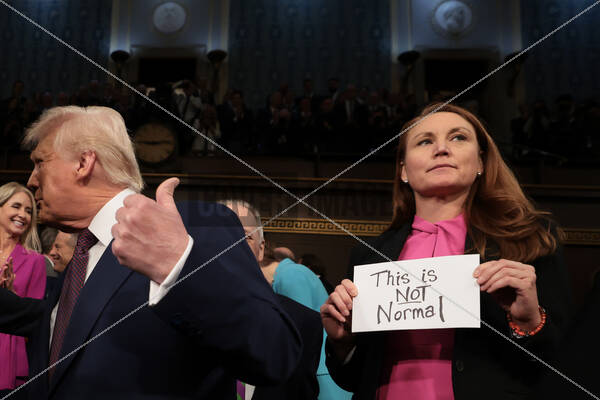 U.S. President Donald Trump arrives for his speech to a joint session of Congress as Rep. Melanie Stansbury (D-NM) holds a sign reading "This is not normal" at the U.S. Capitol on March 04, 2025 in Washington, DC. President Trump was expected to address Congress on his early achievements of his presidency and his upcoming legislative agenda.