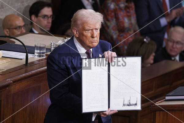 President Donald J. Trump holds a signed directive as he delivers his first State of the Union address of his second term to a joint session of the US Congress in the Hall of the US House of Representatives in the US Capitol