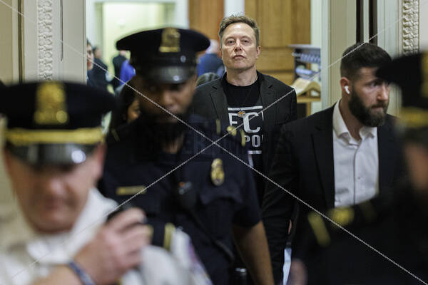 Elon Musk, Chief Executive Officer, Tesla, SpaceX and X (previously known as Twitter) departs a meeting with Senate Republicans outside the Senate Chamber of the Capitol Building