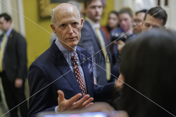United States Senator Rick Scott (Republican of Florida) departs a meeting with Elon Musk (not pictured), Chief Executive Officer, Tesla, SpaceX and X (previously known as Twitter) and Senate Republicans outside the Senate Chamber of the Capitol Building