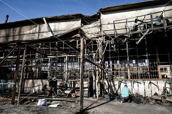 A man carries out repair works at a workshop of the Palianytsia Volunteer Centre destroyed by a nighttime strike of a Russian Shahed drone on March 8, Zaporizhzhia, Ukraine