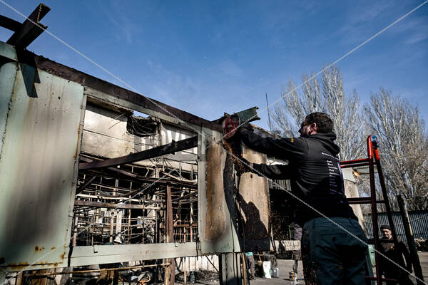 A man cuts out irreparable metal constructions at a workshop of the Palianytsia Volunteer Centre destroyed by a nighttime strike of a Russian Shahed drone on March 8, Zaporizhzhia, Ukraine