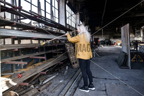 A woman dusts in a workshop of the Palianytsia Volunteer Centre destroyed by a nighttime strike of a Russian Shahed drone on March 8, Zaporizhzhia, Ukraine